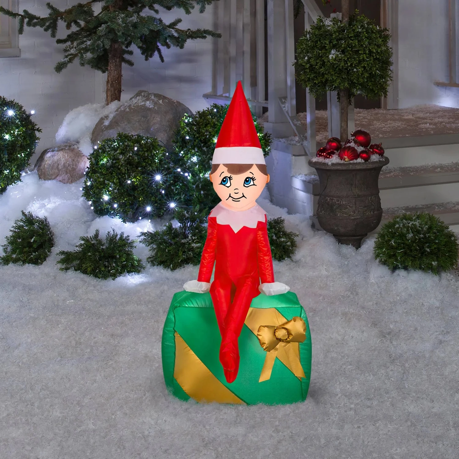 Standing at approximately 42inches tall and 26inches wide this Airblown Elf on Present Elf on the Shelf lights up self-inflates in seconds and deflates for easy storage. Includes lawn stakes and tethers for quick and easy setup. Batteries not required. No additional parts required. No assembly required: plug it in stake it down and the magic unfolds! Provides maximum impact with minimum effort! 38% Polyester 22% Copper, 15% Iron, 15% ABS plastic, 10% Poly Propylene.