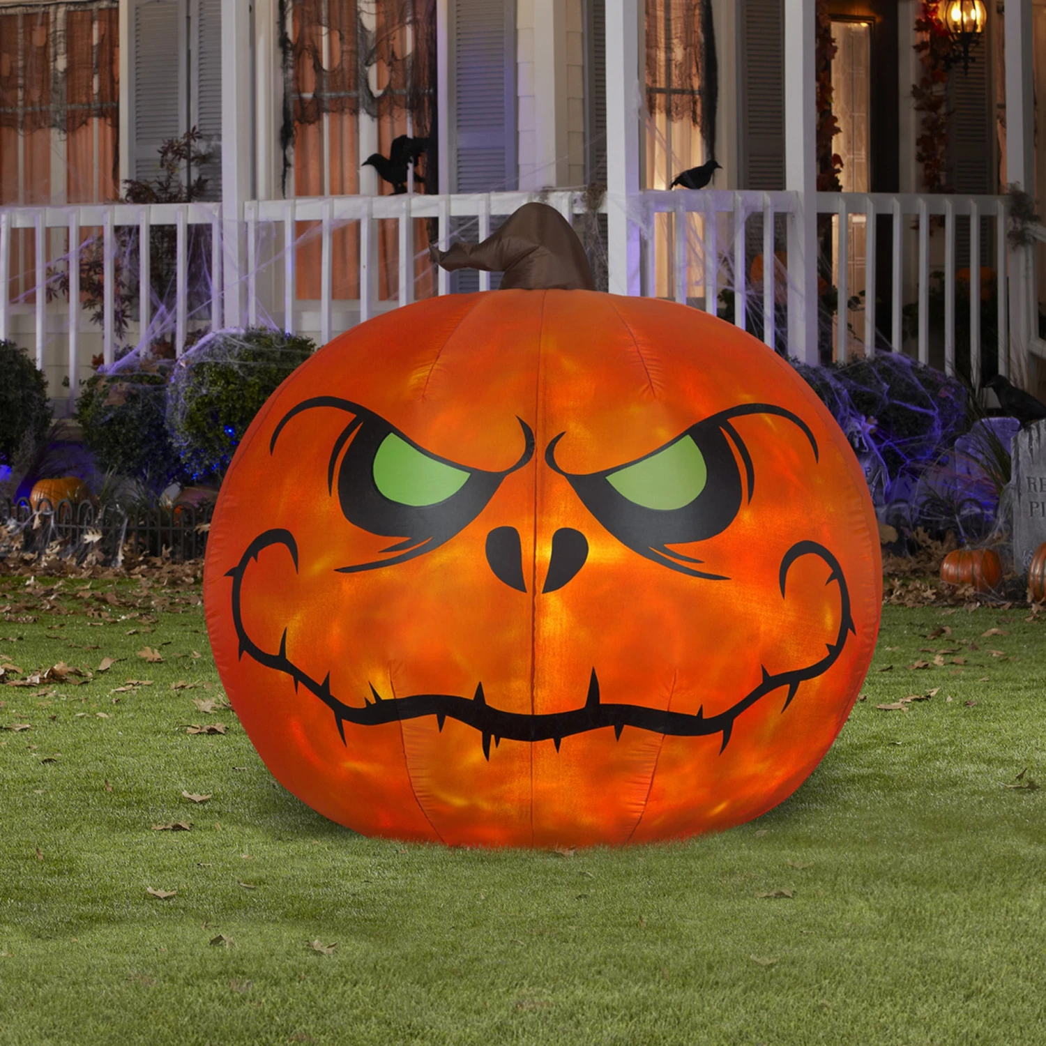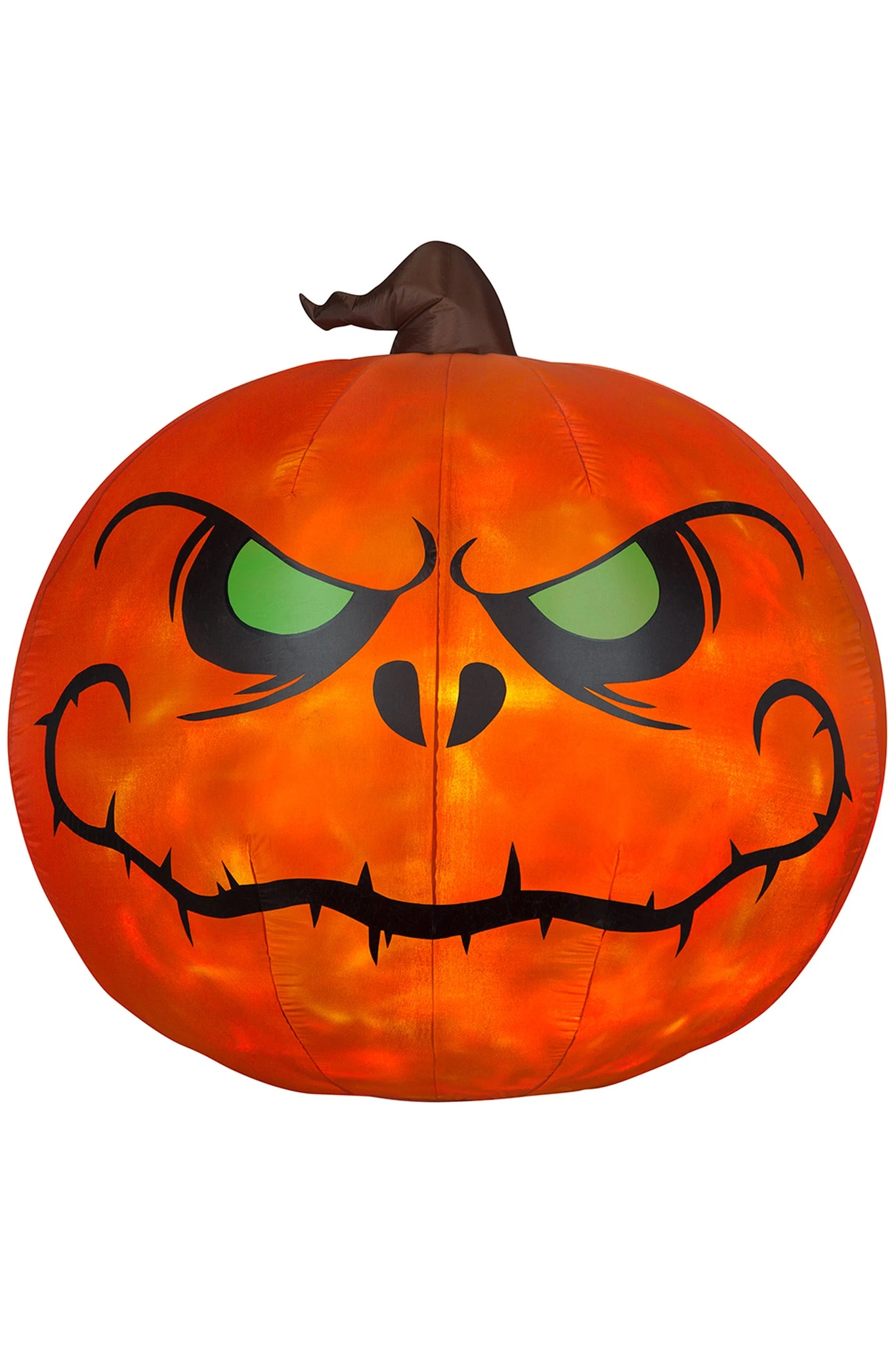 This Reaper Pumpkin Airblown is a great addition to any outdoor Halloween Display. The bright orange and black smirking smile and green eyes will let you know this guys is not having a good day. Comes with everything you need to inflate and securely display your airblown pumpkin. The durable fan will inflate your Reaper Pumpkin within minutes. Also, easy to deflate and store for many Halloweens to come.