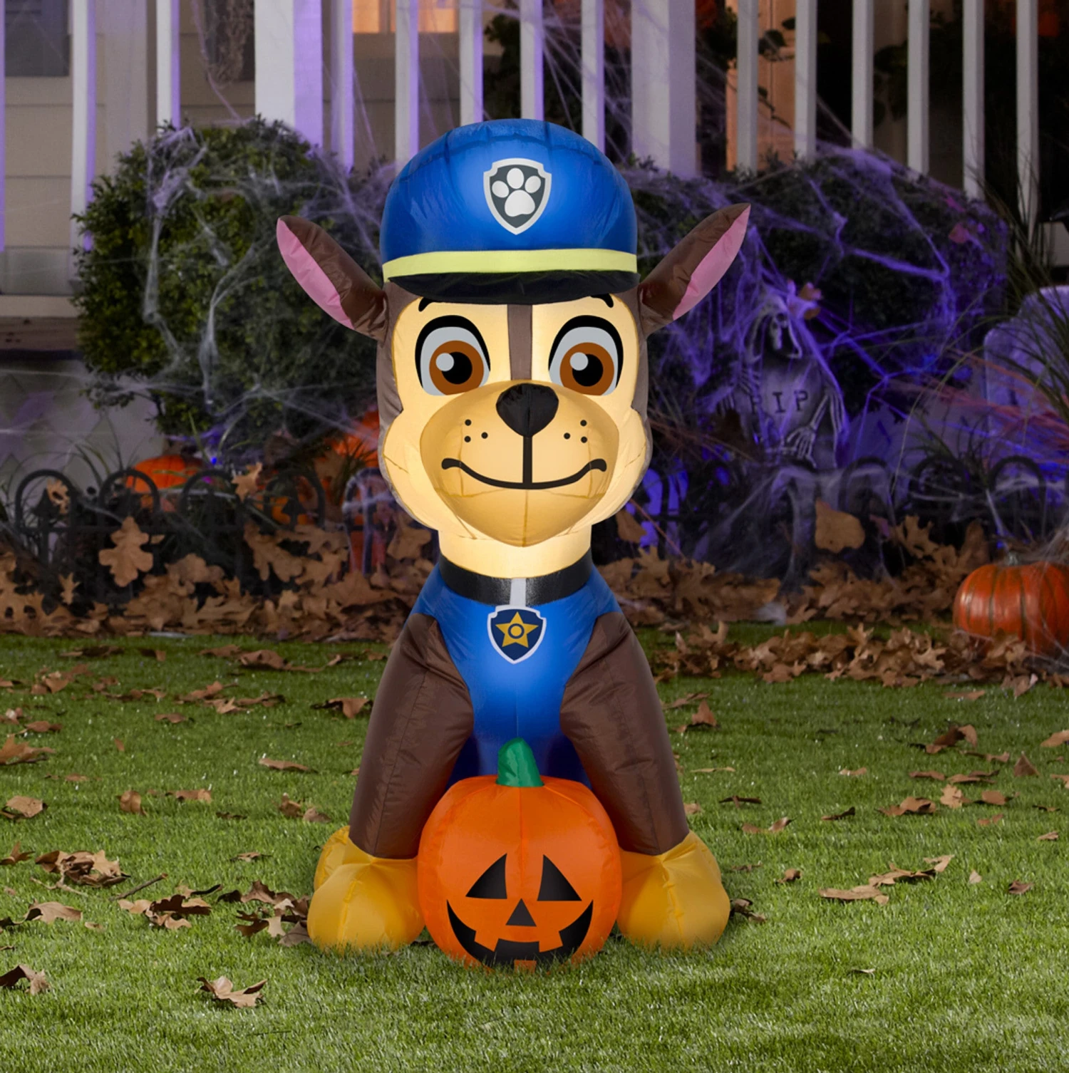Add this 36 in. inflatable to your Halloween yard decor and delight your children! Their favorite character Chase from Nickelodeon’s popular show Paw Patrol holds a pumpkin to celebrate the season. Airblown gives your decor maximum impact with minimum effort and it comes with everything you need for quick and easy set-up. You just stake it down and plug it in. Lights up with clear LED lights Self-inflates in seconds Deflates for easy storage Made of Fabric,80%; Electronics,10%; Plastic,10%. Measures approximately 36 inches tall,20 inches wide, and 30 inches deep. airblown-paw patrol chase w/pumpkin-sm-nick