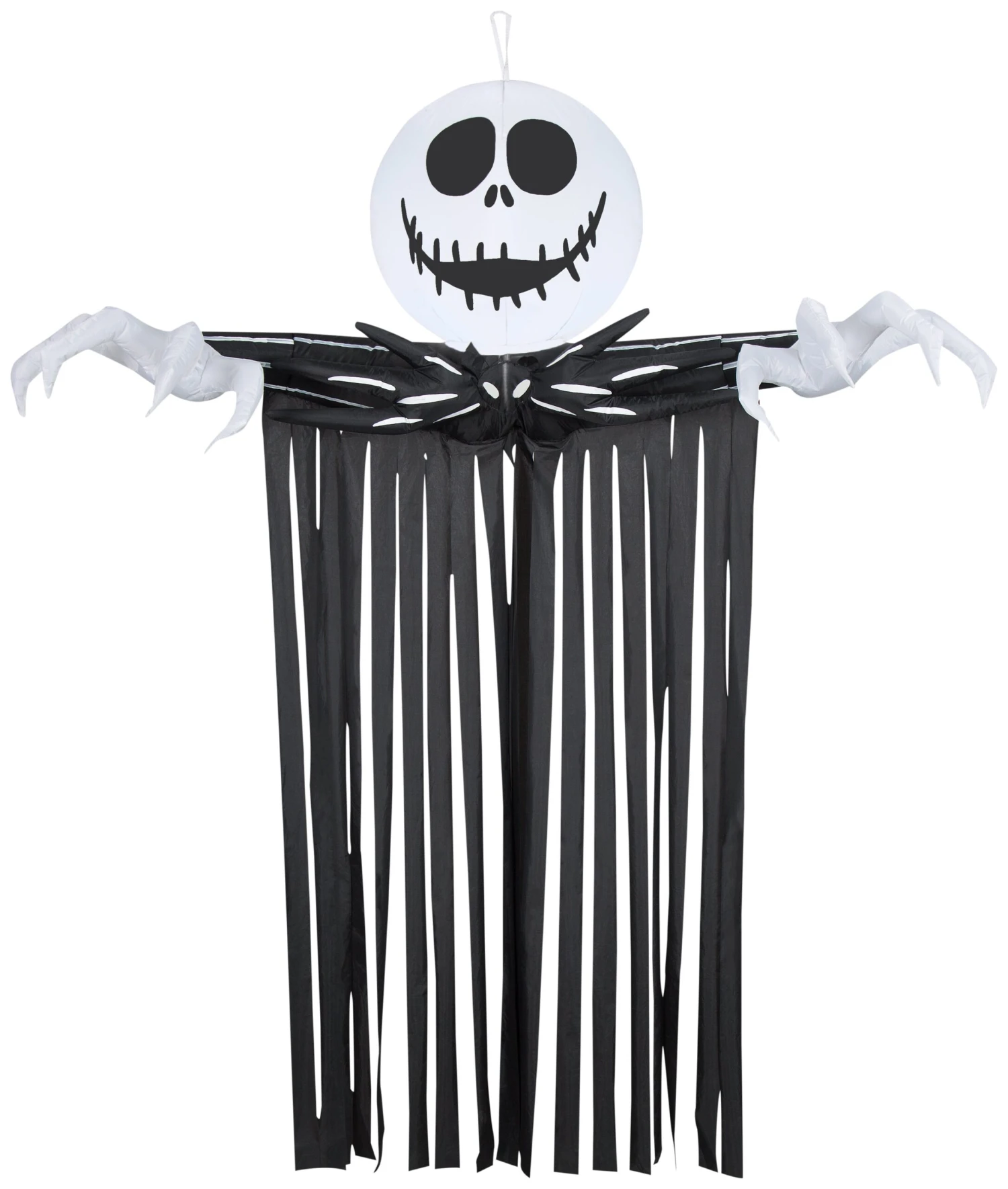 Create an eye-catching entrance or focal point with our Airblown® Inflatable Jack Skellington Door Hanger! This amazing doorway decor features a lighted Jack Skellington at the top and black streamers flowing below welcoming arms. It creates the perfect entrance for parties or greeting your guests. Best of all, this Jack Skellington Halloween decor sets up in a flash for the easiest decorating ever. Includes a loop for easy hanging.