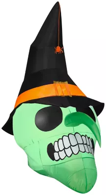 Greet your guests with this adorable Gemmy Air-Blown Green Witch Skull Inflatable. The green witch skull inflatable is perfect for any Halloween scene. Plug it in, stake it down and watch the magic of this air-blown inflatable unfold!