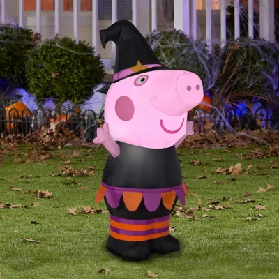Decorate your yard with this adorable Gemmy Air-Blown Halloween Peppa Pig Inflatable. Peppa Pig dresses up as a skeleton in this fun Halloween scene. The air-blown inflatable comes with everything needed for easy outdoor setup. Just plug it in, stake it down and watch the magic unfold. Display this delightful outdoor decoration as a standalone or combine it with other air-blown inflatables to create a custom scene. It’s also perfect as an indoor Halloween decoration for parties and celebrations.