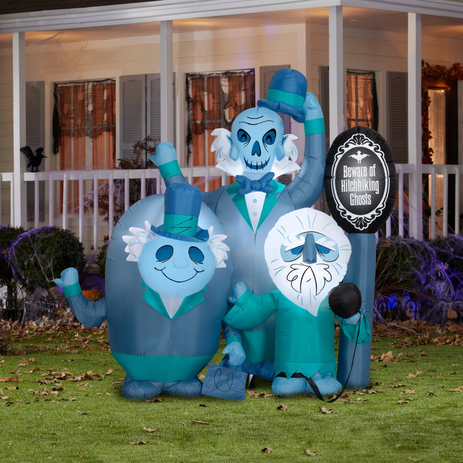 These weary dead travelers need a lift! Featuring three ghostly hitchhiking gents from days gone by, this Haunted Mansion Airblown® Inflatable makes an eye-popping addition to your Halloween decorations. Includes Phineas, Ezra and Gus in a hitchhiking stance with a “Beware of Hitchhiking Ghosts” sign. Setup is super simple. Just plug it in, stake it down and watch the magic unfold. Be the talk of the block with a Haunted Mansion Hitchhiking Ghosts inflatable. Includes everything needed for easy outdoor setup.