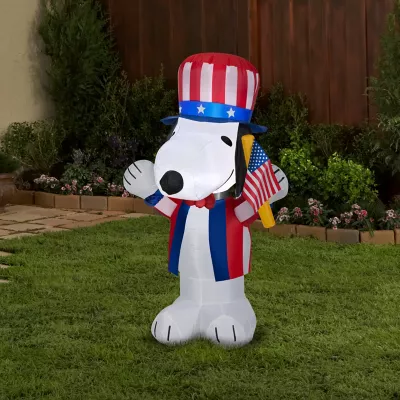 Make a star-spangled statement with a Gemmy Airblown Inflatable Patriotic Snoopy Decor decked out in red, white and blue! Accented with an American flag, this patriotic inflatable makes an eye-catching addition to your July 4th decorations. Setup is super simple, just plug this inflatable decor in, stake it down and watch the magic unfold. Display this Fourth of July decoration as a standalone or combine it with other Airblown Inflatables to create a custom scene. This set includes everything needed for easy outdoor setup.