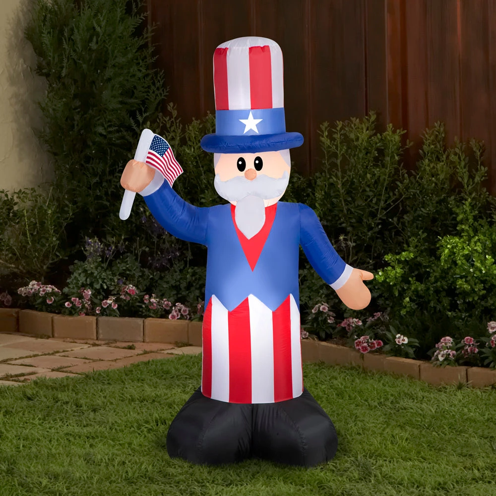For a patriotic display, delight guests and passersby with this Airblown® Inflatable featuring the one and only Uncle Sam. Decked out in red, white and blue and waving an American flag, this classic July 4th decoration will have them seeing stars! Setup is super simple. Just plug it in, stake it down and watch the magic unfold. Display this patriotic inflatable as a standalone or combine it with other Airblown Inflatables to create a custom scene. Includes everything needed for easy outdoor setup.