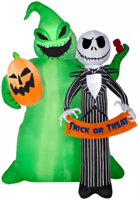 Delight your guests with this amazing Airblown inflatable featuring Jack Skellington and Oogie Boogie from The Nightmare Before Christmas. Jack wears his iconic pinstripe suit and holds a “Trick or Treat” banner. A green Oogie Boogie holds a pair of dice and spooky jack-o’-lantern. Set up is in a snap for the easiest decorating ever. Just plug it in, stake it down and watch the magic unfold. Display this Jack Skellington and Oogie Boogie Halloween decoration as a standalone or combine it with other Airblown Inflatables to create a custom scene.