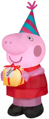 Make the party perfect with the Gemmy Airblown Peppa Pig with Birthday Cake Decor! Accented with a party hat and present, this Peppa Pig inflatable decor makes an eye-catching addition to your birthday decorations. Setup is super simple, just plug this birthday decor in, stake it down and watch the magic unfold. It includes everything needed for easy outdoor setup.