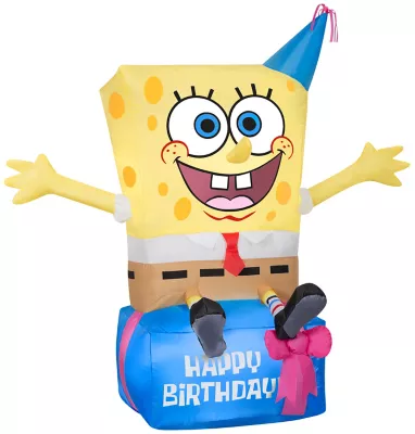 Bring the fun to your next birthday party with the Gemmy Airblown SpongeBob on Birthday Present Inflatable. Each SpongeBob SquarePants inflatable is suitable for both indoor or outdoor use. The set includes stakes and tethers for outdoor setup. This Airblown inflatable lights up with bright, energy-efficient LED lights.
