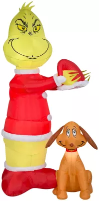Celebrate the season with an animated Airblown Inflatable Grinch placing a Santa hat on Max! Our animated Grinch inflatable makes an eye-catching addition to your outdoor Christmas decorations. Setup is super simple. Just plug it in, stake it down and watch the magic unfold. Comes with everything needed for easy outdoor setup, including stakes and tethers.