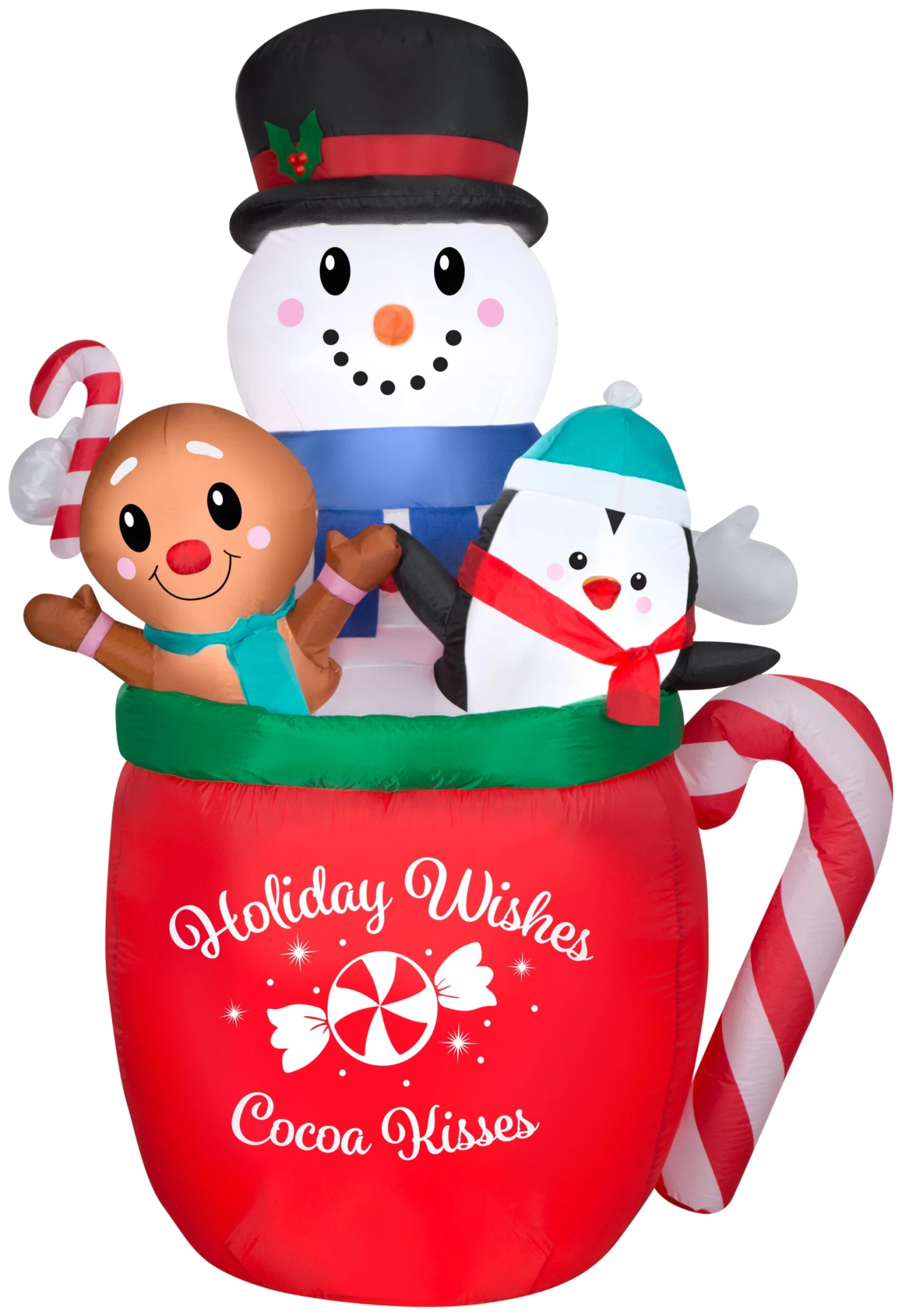 Make the season extra merry with an inflatable snowman and his pals in a cup of hot cocoa! This delightful Airblown® Inflatable features a snowman joined by a gingerbread man and penguin sitting in a Christmas-themed cup with a candy cane handle and “Holiday Wishes, Cocoa Kisses” sentiment. Setup is super simple. Just plug it in, stake it down and watch the magic unfold. Display this snowman Christmas inflatable as a standalone or combine it with other Airblown Inflatables to create a custom scene. Includes everything needed for easy outdoor setup.