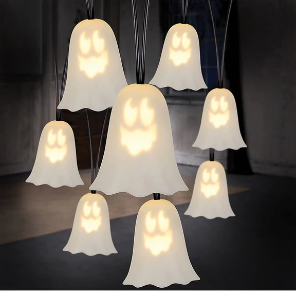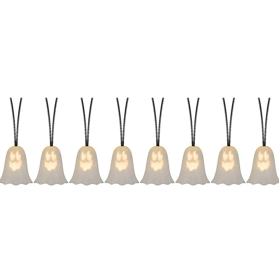 Fun set of 8 Musical Ghost Lights on a String haveinner LED lights that projectMoving Faces singing their favorite song, Ghostbusters! Each White Ghost is appproximately 3 inches tall x 2 inches x 2 inches. Battery-operated string of 8 Ghosts requires 3 AA Batteries, with a Try Me Button on the window display box. Constant On Mode and Sensor Mode activation. 7.87 feet lighted length on black wire to blend into dark or black backgrounds. Great for a Funny Decoration with great music-Everyone will start dancing!