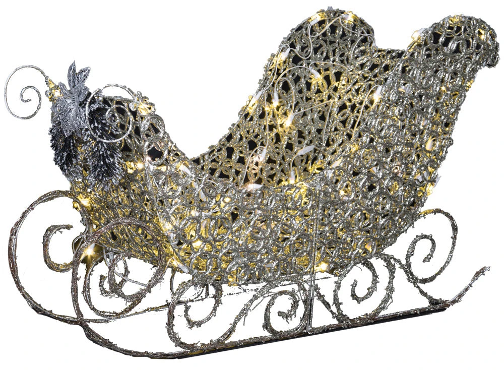 Elegant new yard decor for your Christmas display! Sleigh with Sparkle Rings with Copper Wire has micro LED lights for a soft glow and a festive holiday look. Uses classic white LED lights. Made of Metal 40%; PVC 30%; Electronics 25%; Other 5%. Measures approximately 26 inches tall, 14 inches wide, and 42 inches long.