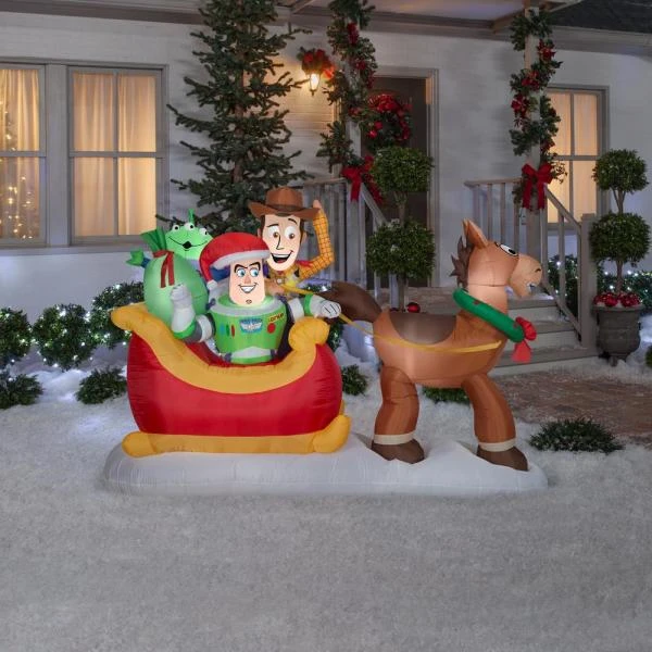 Standing at approximately 62 inches tall and 32 inches wide this Airblown Toy Story with Sleigh Scene lights up lights up with energy efficient LED lights self-inflates in seconds and deflates for easy storage. Includes lawn stakes and tethers for quick and easy setup. Batteries not required. No additional parts or assembly required: just plug it in stake it down and the magic unfolds! Provides maximum impact with minimum effort!Â